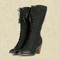 Queste calzature sono molto comode ma anche adatte a slanciare la figura di una dama in occasioni quotidiane o missioni complesse, poiché la vestibilità rende questo stivale ottimo anche per correre! E' di cuoio nero bollito, con un piccolo tacco in legno che rialza un po' la figura di qualche centimetro e forti lacci anteriori che avvolgono tutta la caviglia, fino a metà polpaccio. Resistenti e sobri resistono anche alle intemperie essendo trattati con grasso vegetale impermeabilizzante.