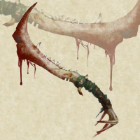 Daga ricurva lunga 55cm tanto rudimentale quanto efficace. E' ricavata da un osso saldato su un corno di capriolo, sul quale laccio di cuoio rende più comoda l'impugnatura. La lama è stata assottigliata per renderla affilata e sulla sua sommità sono stati applicati alcuni corti denti appuntiti così da poter diventare un falcetto all'occorrenza.